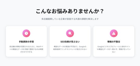 同サービスでは、Googleビジネスプロフィールの情報を自動で構造化データに変換して、専用コードを発行して店舗ビジネスのSEOを自動化します。