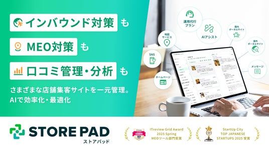 STOREPADは、国内外のさまざまな店舗集客メディアと連携する、店舗情報発信・分析プラットフォームです。地図アプリ・ポータルサイト・インバウンド向けメディア・SNS・HPなど様々な媒体への一括情報発信や口コミ分析で工数削減と集客向上、効果的なMEOを実現。店舗運営を成功に導きます。