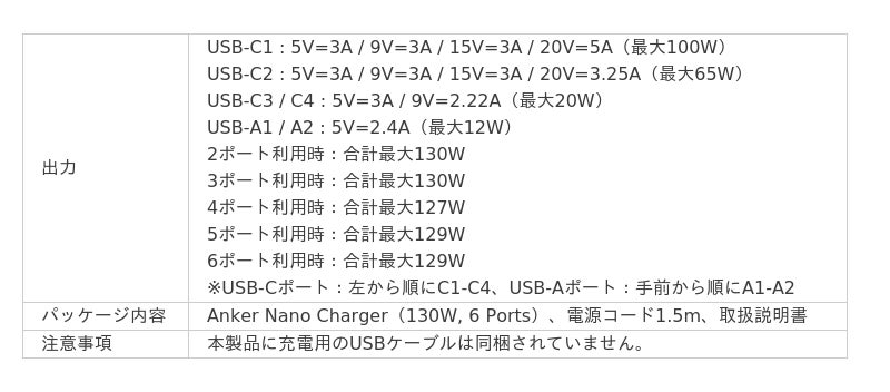 - 6台同時に充電可能:4つのUSB-Cポートと2つのUSB-Aポートを搭載し、合計6台の機器を同時に充電可能。合計最大130W、単ポート最大100Wの出力でMacBook Proの充電にも対応する他、MacBook Air、iPhone 16、AirPods等を3台同時に充電できます。