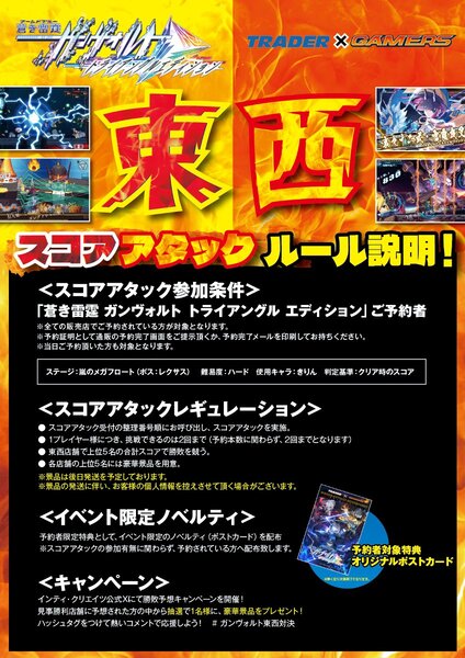 スコアタック大会の参加条件は、『蒼き雷霆(アームドブルー) ガンヴォルト トライアングル エディション』の通常版、又は、10周年記念(テンスアニバーサリー)コンプリートBOXの予約を証明できるものを持参すること。東西それぞれで5位以内に入賞したプレイヤーには、本ベント限定の記念盾が授与されるので、ぜひとも参加しよう。