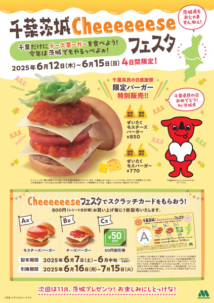 モスバーガーは千葉県と茨城県内の全80店舗で、6月12日から15日までの4日間限定のキャンペーン「千葉茨城Cheeeeeeseフェスタ」を実施します。