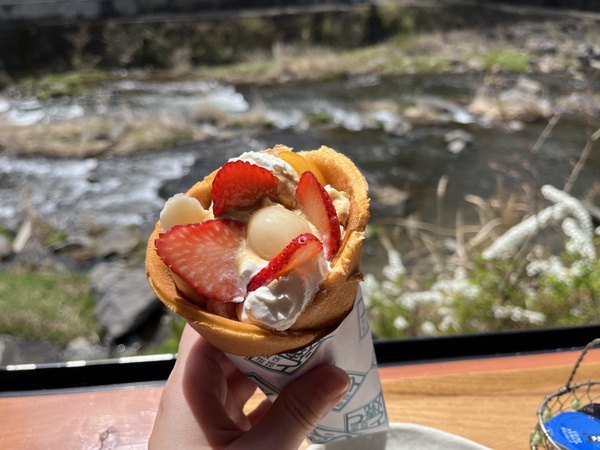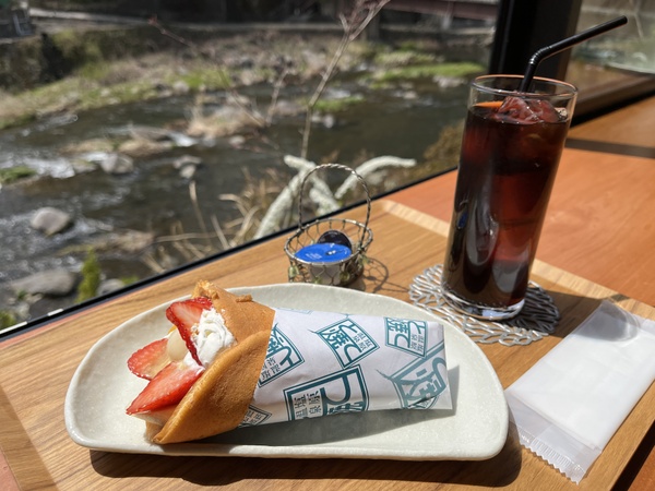 今回訪れた和菓子店「榮太楼」では、地元で採れた旬のフルーツを使った「季節のとて」が食べられます。私が行ったタイミングではイチゴのとて焼きが登場。中にはイチゴと生クリームの他に、あんこや白玉、バナナなどが包まれていて、まるでフルーツあんみつやパフェのよう! 生地はスポンジのようにふわふわしっとりしていて、洋菓子っぽさがあるスイーツです。