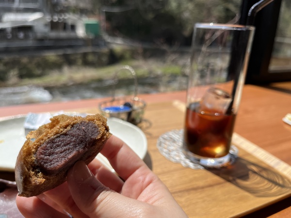 とて焼きに入っているのは榮太楼自慢のあんこ。せっかくなので人気の温泉まんじゅうをいただくと、甘さ控えめでさらりとなめらかなあんこと黒糖生地がよく合います。