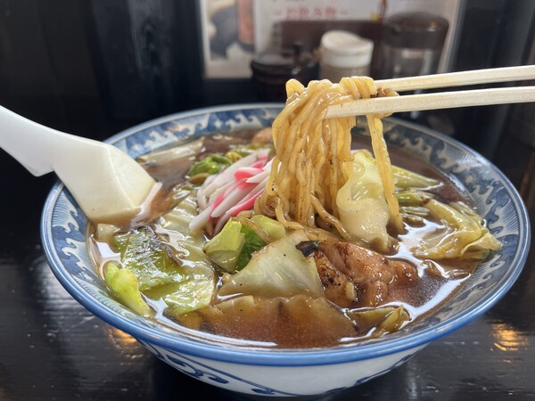 店主の遠藤和久さんによると、スープ入り焼きそばが誕生したのは1950年代後半頃なのだそう。「先代が経営していた時に、お客さんから焼きそばとスープの注文を受けたんです。でも当時はラップなどがない時代だったので、そのまま運ぶとスープがこぼれてしまったんです。そこで“スープの中に焼きそばを入れてしまおう”と思いついたことで生まれたメニューなんです。そこから味のバランスを研究して、2、3年後に完成しました」(遠藤さん)。