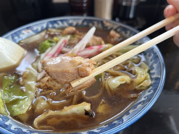 具材は鶏肉、キャベツ、なると、そしてソース焼きそば。食べてみると当然ですがラーメンではなく、焼きそばの味です。一方のスープは出汁の風味を感じる醤油味。野菜は香ばしく炒められているし、でもなるともあるし、不思議なメニューだ…と思って食べ進めているうちに、スープに焼きそばのソースが溶け出して焼きそば度が上がってきました。何これ面白い。スープがスパイシーになってきて、汗が止まらない!