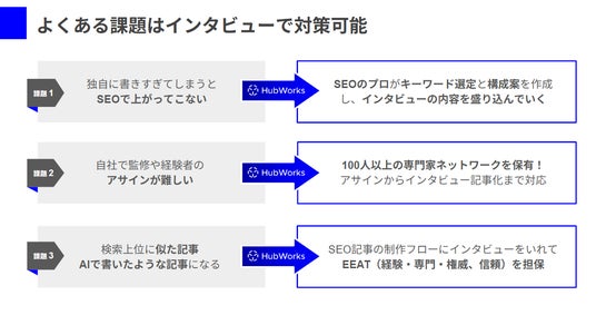 - 多くの企業が抱える記事制作の課題に対し、どのように「インタビュー」という手法で解決できるのかを以下に整理しました。HubWorksの支援体制により、専門家の声を生かしたオリジナリティと信頼性のあるコンテンツ制作が可能です。
