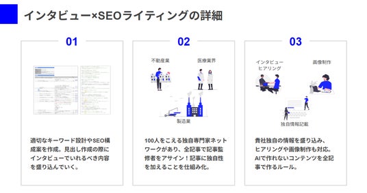 キーワード作成やSEOの構成案がプロが丁寧に制作。インタビューで専門性・経験談などをいれ、AIではできないオリジナルコンテンツを作成します。