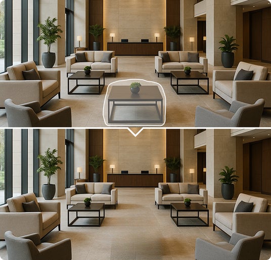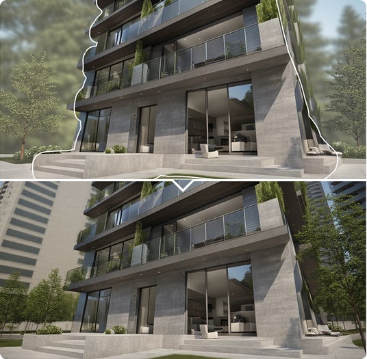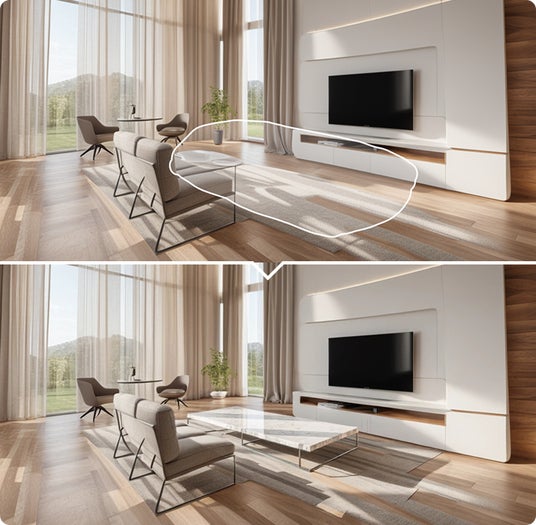 一度生成したパース画像に対して、家具や建具、植栽などの要素を後から自然に追加したり、一部を変更・削除することが可能です。理想とするパース画像をスムーズに仕上げることができます。