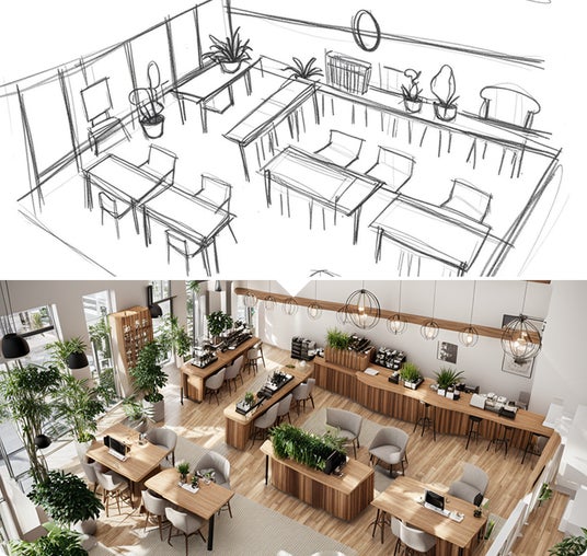 手書きのスケッチをACIMUSにアップロードするだけで、図面や3Dモデルがなくてもイメージベースでリアルな建築パース画像を手軽に生成できます。