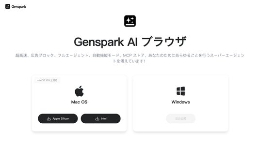 「Genspark AIブラウザ」は、macOS(15以降/Apple Silicon・Intel)およびWindowsに対応する最新の生成AI内蔵ブラウザです。リリースと同時に、超高速表示、高度な広告ブロック、自動操縦モード、MCPストアとの連携など、Web操作のすべてを自動化する「スーパーエージェント」機能を搭載しています。