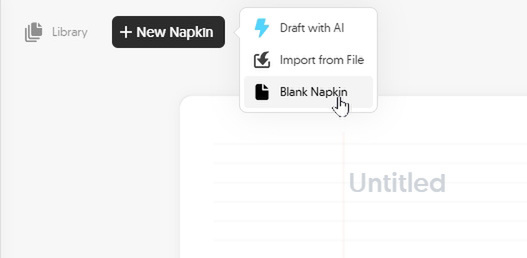 図解の元となるテキストを用意する方法は3つある。1つ目が空のページから作業を始める「Blank Napkin」、2つ目が、簡単なキーワードからAIに文章を生成させる「Draft with AI」、3つ目が、「Import from File」となる。