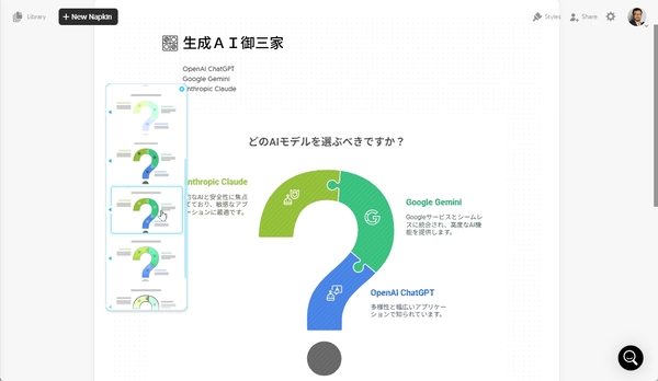生成された図解のクオリティの高さに驚くはず。単に文字を並べるのではなく、何が書かれているのか判断し、図の構成を考えたり、テキストを追加しているのだ。「AIの巨人たち」や「どのAIモデルを選ぶべきか?」など、異なる切り口を提案してくれるのもすごい。それぞれのAIに説明も付けている。