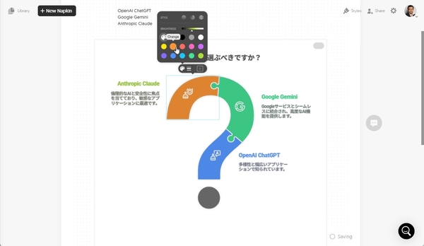 気に入った図解をクリックすると、続けてカスタマイズが可能だ。例えば、AIが生成したタイトルや説明文が気に入らなければ修正できる。色やアイコンのデザインを変更することもできる。例えば、4つ目のAIを追加することもできるのだ。