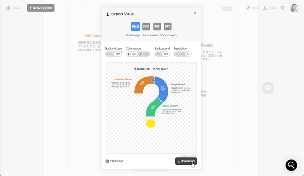 完成したら、右上の「Export」ボタンからダウンロードできる。その際、用途に応じていろいろと選べるのが便利。例えば、ファイル形式はPNG、SVG、PDF、PPTに対応。PPTX形式でエクスポートしておけばPowerPointやGoogle Slidesで直接編集を加えられる。「Background」のスイッチをオフにすると背景を透過させられるので、ウェブサイトのデザインや印刷物を制作する際に便利だ。サイズも2倍、3倍で出力できる。