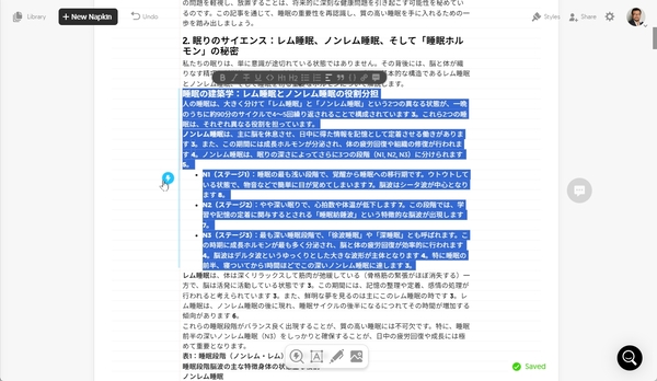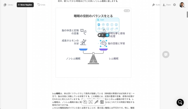 試しに、Geminiで生成した「眠りの質を上げる」記事を貼り付けて、図解を生成してみよう。「レム睡眠とノンレム睡眠の役割分担」についてのパラグラフを選択し、青いアイコンをクリック。このパラグラフにはレム睡眠とノンレム睡眠の役割に加え、ノンレム睡眠時のステージについての解説も入っている。そこでNapkin AIは両方の図解を生成してくれた。