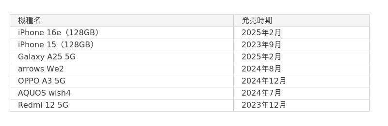 下記が現在販売されている「1円スマホ」の一例とその発売時期です。