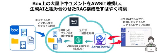 「AcroChatAI」では、Boxに蓄積された大量のドキュメントを、生成AIと連携可能なクラウド環境に効率よく同期し、エンタープライズ向けのRAG(ラグ:Retrieval-Augmented Generation)構成をすばやく構築することが可能です。今回のBoxエコシステムソリューション認定は、これらの高度な連携機能が評価されたものです。