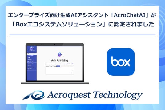 アクロクエストテクノロジー株式会社(本社:神奈川県横浜市・代表取締役:新免流、以下、アクロクエスト)が提供するエンタープライズ向け生成AIアシスタント「AcroChatAI」が、コンテンツクラウド「Box」の「Boxエコシステムソリューション」に認定されたことをお知らせいたします。本認定により、Boxとの連携における信頼性と利便性が公式に認められ、より高度なドキュメント連携を実現する生成AIアシスタントの提供が可能となります。