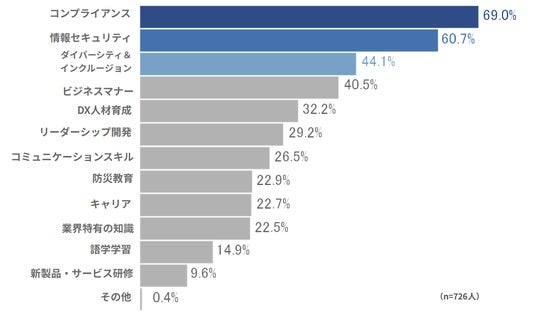 eラーニングで実施されている研修内容としては、「コンプライアンス」(69.0%)、「情報セキュリティ」(60.7%)が上位を占め、企業全体で共通するリスク管理や法令遵守に関するテーマが重視されていることがわかりました。一方で、「DX人材育成」(32.2%)や「リーダーシップ開発」(29.2%)といった中長期的な人材戦略に関わる領域の取り組みも進みつつあるものの、導入状況にはまだばらつきが見られます。