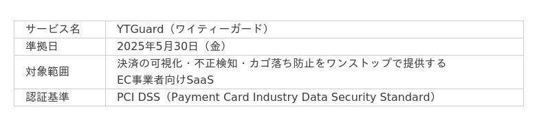 株式会社YTGATE(本社:東京都中央区、代表取締役:高橋祐太郎、以下「YTGATE」)は、2025年5月30日(金)、決済の可視化・不正検知・カゴ落ち防止をワンストップで提供するEC事業者向けSaaS「YTGuard」が、クレジットカード業界の国際セキュリティ基準「PCI DSS」に準拠したことをお知らせします。