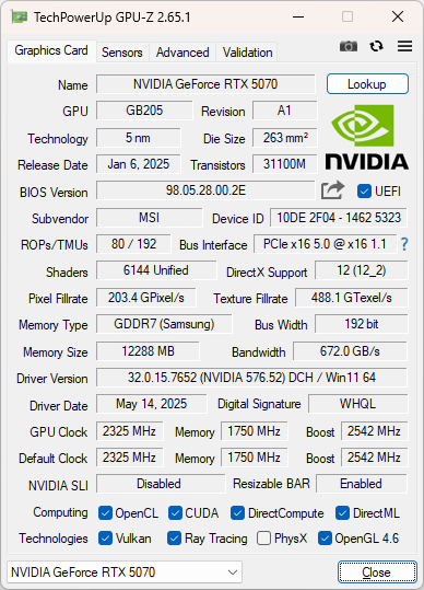 組み合わされるGPUは「GeForce RTX 5070」(以下、RTX 5070)で、試用機ではビデオカードにMSIの「GeForce RTX 5070 12G VENTUS 2X OC」が装着されていた。
