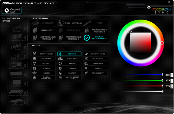 このマザーボードは、チップセット周辺にLEDが搭載されているが、ZEFT Z55IGの標準構成で点灯するのはこの箇所だけとイルミネーションは控えめだ。このLEDは、マザーボードの設置ツール「POLYCHROME RGB」から色やイルミネーションを変更可能。