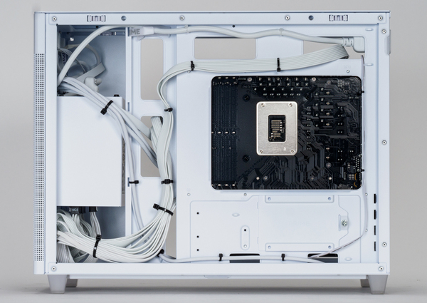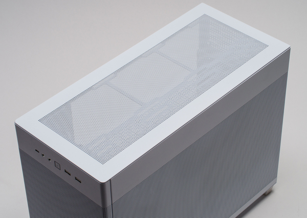 また、電源ユニットがフロントパネルに設置され、電源ユニットのファンが前面からの吸気を担っている点は非常にユニークだ。なお、フロントパネルにはヘッドフォン出力とマイク入力のほかに、USB 3.2 Gen.2 Type-Cを1基と、USB 3.2 Gen.1 Type-Aを2基搭載し、使い勝手は上々だ。