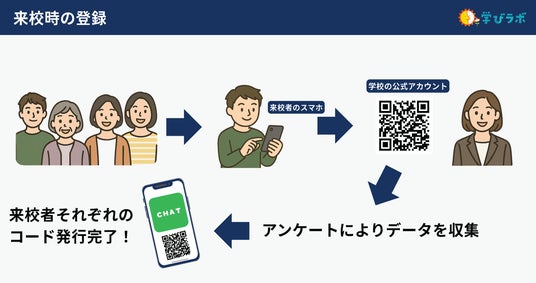1.LINEアプリから学校公式アカウントに登録します。アンケートに回答いただくことで、個人データが集計システムに紐づけられます。