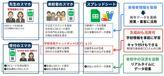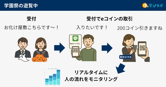 学園祭の来場者に向け、学校独自の疑似通貨を発行し、LINEアプリのシステムを用いて電子取引を行うことで取引データを集計します。