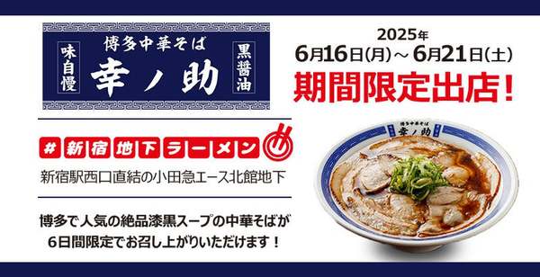 ウインズジャパンホールディングスがプロデュースする「博多中華そば幸ノ助」が、6月16日から6日間限定で「#新宿地下ラーメン」に出店する。新宿駅西口地下街に位置する「SHINJUKU DELISH PARK」内で、話題のラーメンPOPUPストアとして注目を集める場での販売だ。