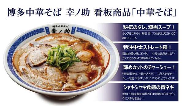 漆黒のスープが特徴の「博多中華そば幸ノ助」は、福岡で120年以上の歴史を持つ醤油蔵元「ヤマタカ醤油」の熟成醗酵醤油を使用し、独自の熟成方法で旨味を引き出した特製醤油タレを用いている。鶏ガラと豚からとった濃厚でコクのあるスープが、福岡の製麺所『製麺屋慶史』が作る特注の中太ストレート麺と見事に調和している。