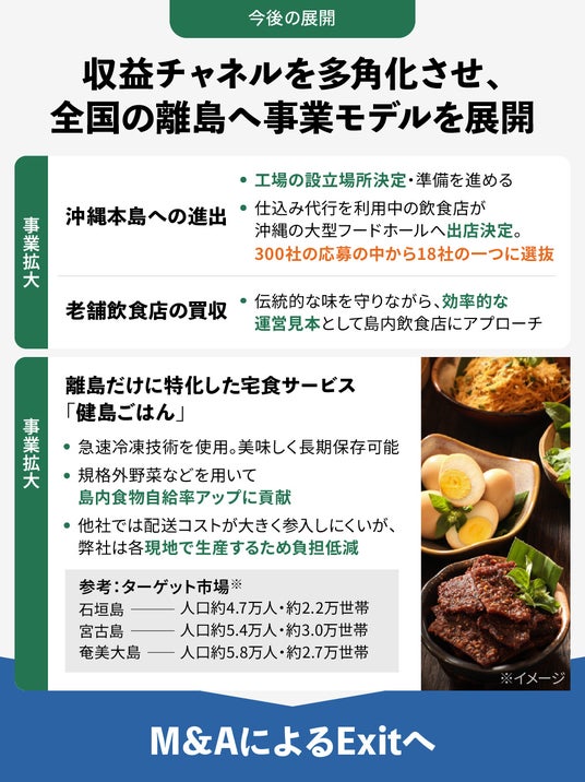 将来的には、那覇(沖縄本島)、宮古島、奄美大島、さらに県外離島や都市圏への展開を計画しており、石垣島での成功モデルを基に地域密着型の「食のインフラ」を横展開していく方針です。また、加工受託やOEM開発による収益多角化も図ります。
