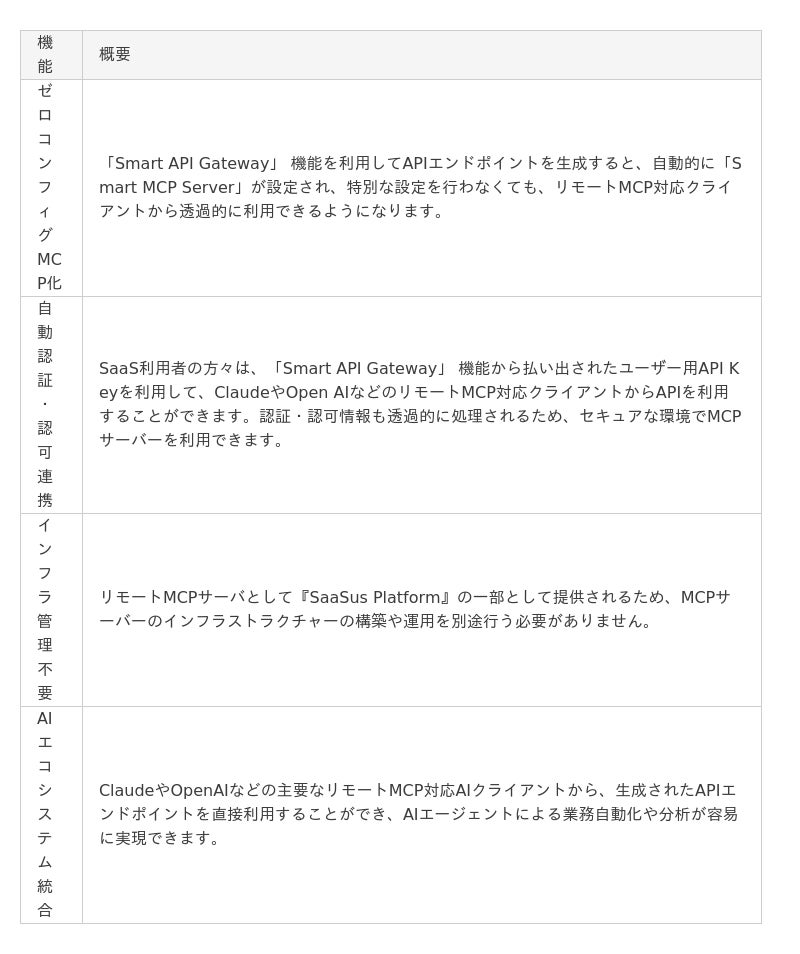 「Smart MCP Server」は、『SaaSus Platform』の一部として提供され、APIエンドポイントを生成する際に自動的にMCPサーバとしての設定が行われます。これにより、特別な設定を行わなくても、「Smart API Gateway」 機能で生成したAPIエンドポイントをリモートMCP対応クライアントから透過的に利用できるようになります。