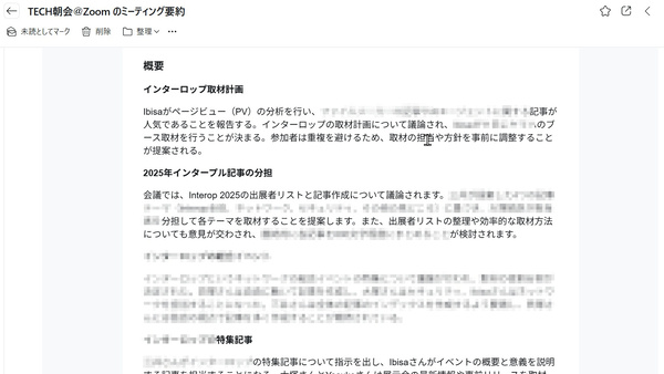 わたしは当初、「生成AIでは、このミーティングはうまく要約できないだろうな……」と思い込んでいました。アジェンダがあって話の流れが整っている正式な会議ならばともかく、話があちこちに飛ぶ雑談ミーティングの要約なんて無理だろう、と。