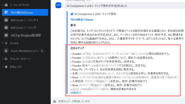 上述した要約機能を使うと、ミーティングで各メンバーに割り当てられたタスク(やるべきアクション項目)も、Zoomでの発言者名にひも付ける形で自動的に抽出、リストアップされます。