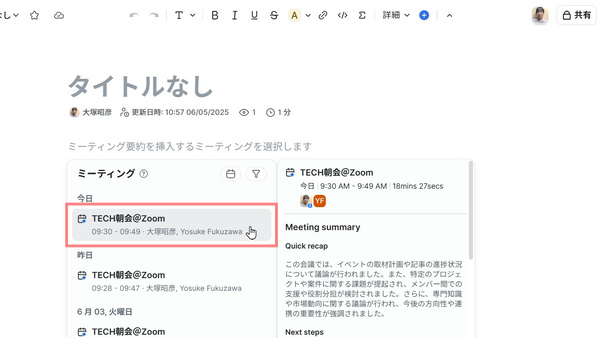 ドキュメントツールの画面で「ミーティングから作成」をクリックすると、過去に開催されたZoom Meetingsのリストが表示されます。選択すると、ドキュメントとしてミーティング内容のサマリが作成されます。これをベースに編集して、議事録を完成させればよいでしょう。