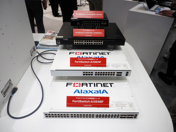 Interopのフォーティネット/アラクサラブースでは、初の共同開発製品として、2.5G/5Gマルチギガアクセスポートと10G/25Gアップリンクを備えるL2アクセススイッチ「FS-AX600Fシリーズ」の2台が展示されていた。