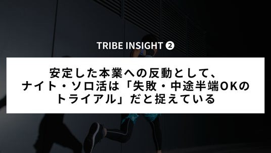 本業での効率や成果を追求する一方で、夜は「失敗しても構わない挑戦の場」。ソロ活であるがゆえに誰にも迷惑をかけず、思い切った行動が可能となっています。