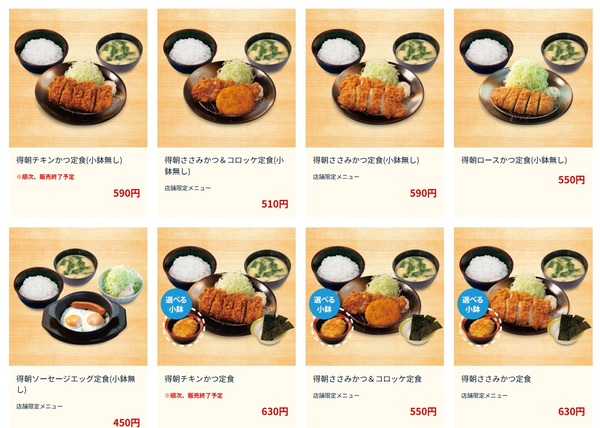 自慢のロースカツを楽しめる「得朝ロースカツ定食」は550円、朝食らしい「得朝ソーセージエッグ定食」は450円。また、店舗限定メニューではありますが「玉子丼」をお手頃価格の300円で提供しています。