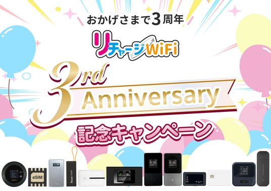 株式会社カウスメディアは、「必要なときに欲しい分だけギガをリチャージ」にてご好評をいただいているリチャージ式モバイルWi-Fi『リチャージWiFi』の3周年を記念して、【リチャージWiFi3周年記念キャンペーン】を、2025年6月13日より開始することをお知らせします。