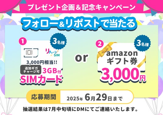 1.初回ギガ3GB付きSIMカード or Amazonギフト券 それぞれ3名様にプレゼント