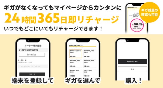 リチャージ式とは初回ギガを使い切っても、マイページからギガをリチャージすることで繰り返し通信を使えるサービスです。リチャージ方法は簡単でマイページに端末を登録したら、あとはお好きなギガを選んで購入するだけ。しかも端末登録は最初の1回だけで、登録するとギガの残量や有効期間の確認などもスマートフォンなどのデバイスから確認が行えます。リチャージも24時間365日いつでもどこでもリチャージできるので、ルーターが手元になくてもリチャージ、ギガ状況の確認が行えます。