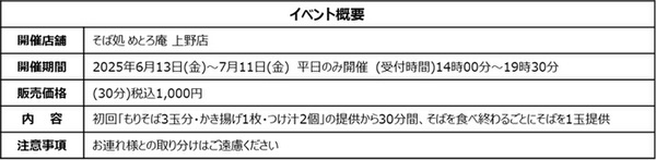 「そば処 めとろ庵」は上野店限定で、6月13日~7月11日の平日限定で、30分間「そば食べ放題」を開催します。受付時間は14時から19時30分間。価格は1000円です。