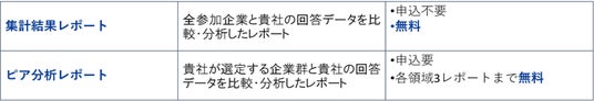 - 全参加企業や同業他社などの任意の企業群と比較し、自社の報酬水準やコーポレートガバナンス改革の実質化に向けた取組みの立ち位置の把握(参加および集計結果レポート、ピア分析レポート(3パターンまで)は無料)