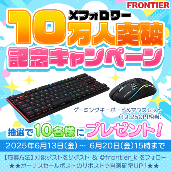 フォロワー10万人突破を記念して、FRONTIER公式Xアカウント(@frontier_k)をフォローし、対象の投稿をリポストすることで、抽選で10名に「FRONTIERゲーミングキーボード&マウスセット」が当たるリツイートキャンペーンが実施される。