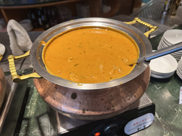 ランチメニューの「カレービュッフェ」というメニューを選択すると、4種類のカレー、ナン、ターメリックライス、サラダが食べ放題で税込1250円。どれだけ食べても1250円。今どき、インドカレー店でランチセットを頼んでも同じくらいの価格ですよね。そう考えるとけっこうお得ではないでしょうか。