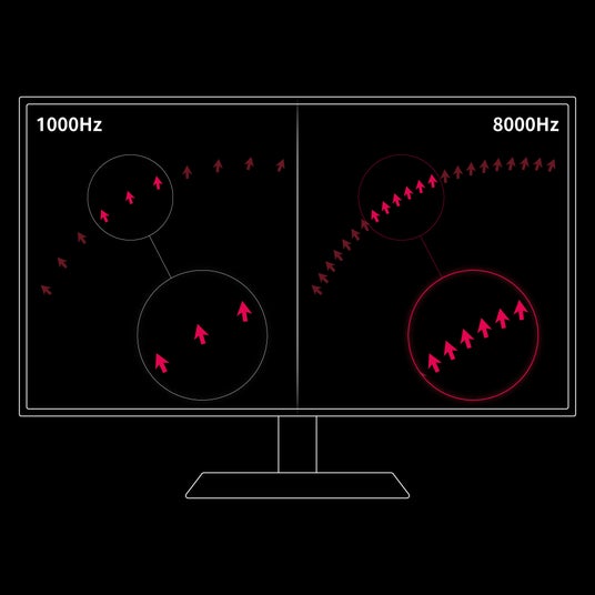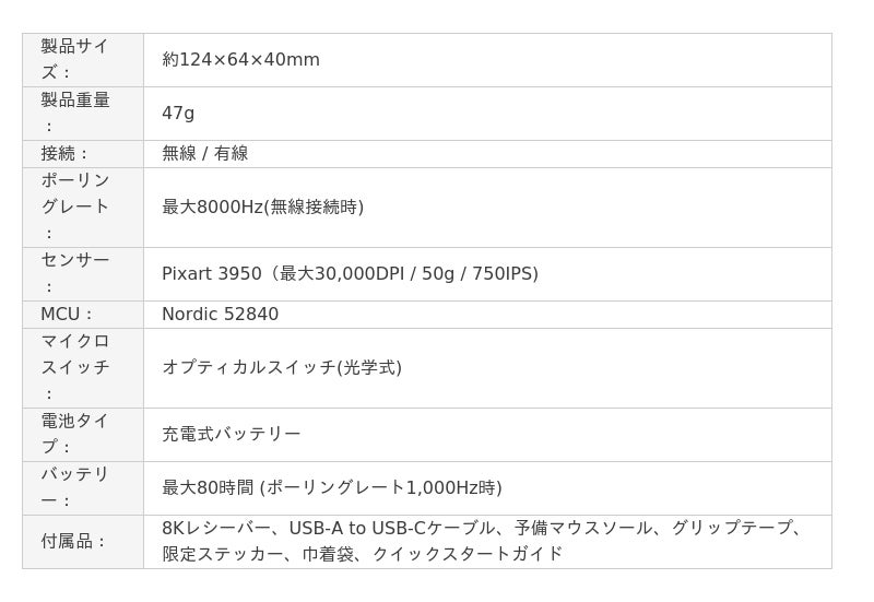 付属のワイヤレスドングルは8000Hzポーリングレートに対応。マウスの微細な動きも、PCへ1秒間に最大8000回という圧倒的な頻度で伝達します。これにより安定感と超低遅延の操作感を実現。コンマ1秒の反応が勝敗を分ける世界で、究極の精度を提供します。