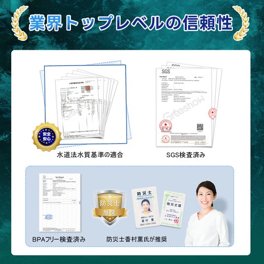 Greeshow携帯浄水器は、厚生労働省の厳しい水質基準をクリアした信頼の製品です。