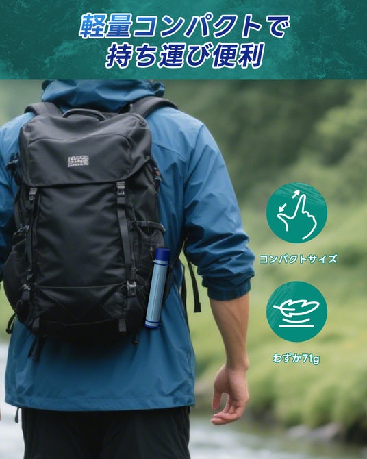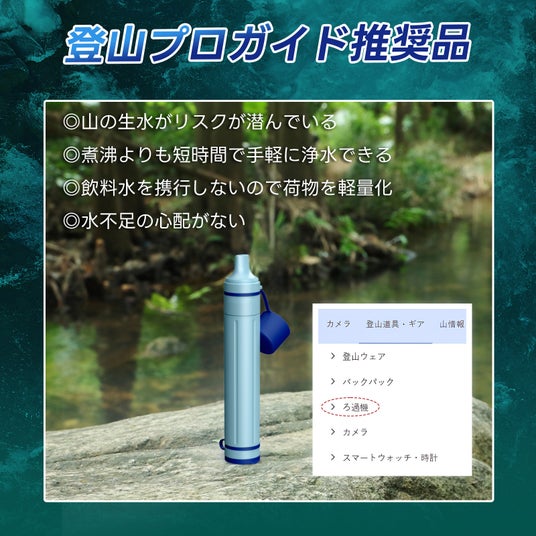 たくさん水を持ち運ぶ必要がなく、川や湖など、各地に点在する水源から採水してすぐ飲めるため、登山やロングトレイルで親しまれています。