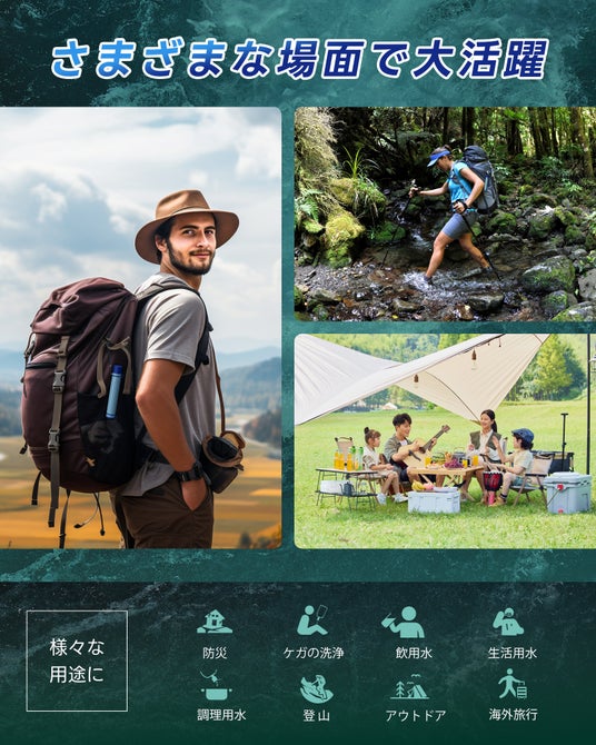 キャンプや登山などのアウトドアシーンで、飲み水を自然の水源から補給する際にも活躍します。
